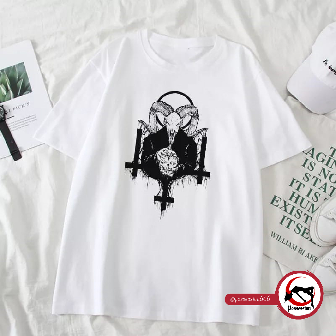 Su ilustración central, protagonizada por una figura cabruna con tintes infernales y símbolos ocultistas, convierte esta prenda en un ícono visual para quienes siguen corrientes como el soft goth, metal alternativo o el streetwear oscuro. Puedes llevarla con jeans rotos, botas, chokers o faldas negras para un impacto aún mayor.